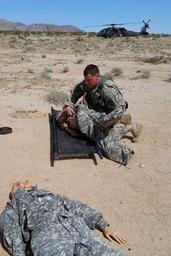 Keywords: weed army community hospital weedarmycommunityhospital wach national training center nationaltrainingcenter ntc fort irwin fortirwin california col. jason wieman coljasonwieman command sgt maj. albert harris commandsgtmajalbertharris 2916th aviation battalion 2916thaviationbattalion emergency medical care emergencymedicalcare meddac rhc-c rhcc patient care patientcare soldier readiness soldierreadiness army training armytraining medical evacuation medicalevacuation medevac capt. sean donohue captseandonohue outdoor FORT IRWIN, Calif. -- The 2916th Aviation Battalion utilized an off-cycle window in their calendar March 20 - 23 to conduct brigade-level training in the National Training Center's "Box". The exercise culminated at the Fort Irwin Weed Army Community Hospital (WACH) March 23. The goal of the training is to test readiness as well as hone emergency medical skills among the participating service members. One simulation presented the participants with an Improvised Explosive Device (IED) attack on a troop transport that resulted in 16 casualties. The role players required triage at the point of injury in the training area, then airlifted back to the WACH on Fort Irwin for treatment. This was a large-scale training module that involved complex planning. To make the exercise as authentic as possible training units had no warning of what they would encounter throughout the course of the event and participants were alerted only as the scenario unfolded, just as if the casualties and events were real. Large casualty events of this kind take a special type of planning coordination, material and geography to execute, and even more consideration to undertake, which makes the NTC an ideal venue for such training. The 2916th assumed the role of air medevac, requiring multiple airlifts to bring all casualties back to the WACH, where staff members prioritized, stabilized and treated the mock casualties, then prepared to fly any they determined needing specialized care beyond WACH capabilities to other nearby available medical facilities for more extensive treatment. To learn more about the people and facilities of the National Training Center and the Weed Army Community Hospital visit their official websites at www.irwin.army.mil or www.irwin.amedd.army.mil Photo by Captain Sean Donoghue for WACH Public Affairs (Released), FORT IRWIN, Calif. -- The 2916th Aviation Battalion utilized an off-cycle window in their calendar March 20 - 23 to conduct brigade-level training in the National Training Center's "Box". The exercise culminated at the Fort Irwin Weed Army Community Hospital (WACH) March 23. The goal of the training is to test readiness as well as hone emergency medical skills among the participating service members. One simulation presented the participants with an Improvised Explosive Device (IED) attack on a troop transport that resulted in 16 casualties. The role players required triage at the point of injury in the training area, then airlifted back to the WACH on Fort Irwin for treatment. This was a large-scale training module that involved complex planning. To make the exercise as authentic as possible training units had no warning of what they would encounter throughout the course of the event and participants were alerted only as the scenario unfolded, just as if the casualties and events were real. Large casualty events of this kind take a special type of planning coordination, material and geography to execute, and even more consideration to undertake, which makes the NTC an ideal venue for such training. The 2916th assumed the role of air medevac, requiring multiple airlifts to bring all casualties back to the WACH, where staff members prioritized, stabilized and treated the mock casualties, then prepared to fly any they determined needing specialized care beyond WACH capabilities to other nearby available medical facilities for more extensive treatment. To learn more about the people and facilities of the National Training Center and the Weed Army Community Hospital visit their official websites at www.irwin.army.mil or www.irwin.amedd.army.mil Photo by Captain Sean Donoghue for WACH Public Affairs (Released),