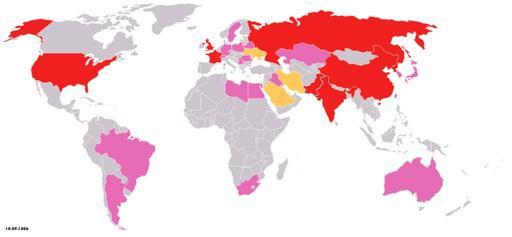 | Keywords: Nuclear weapon programs worldwide 2006.PNG an update for Image Nuclear weapon programs worldwide png based on that image orignaly created by user Fastfission key <font color ED2024 >Red</font> Seven nuclear weapons states from the NPT USA Russia UK France PRC North Korea India Pakistan <font color FFBC3C >Light orange</font> States suspected of having possession of or suspected of being in the process of developing nuclear weapons Israel Iran Ukraine Saudi Arabia <font color E368B0 >Pink</font> States which at one point had nuclear weapons and/or nuclear weapons research programs Historical states have been represented by their successor states i e Yugoslavia by Serbia and Montenegro as they apparently inherited the nuclear materials of the socialist state after it fragmented 2006-10-10 own assumed Havelock אנג יה צריכה היות צבועה באדו ו סגו Nuclear weapons Maps of the world without Antarctica |