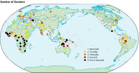 | Keywords: Number genders.png linguistic map Number of genders in the Languages of the World 256 languages sample Based on WALS Check categories 2009 April 30 ru wikipedia Род_ лингвистика ru wikipedia Именной_класс 2 Semantics Syntax Linguistic typological maps Gender-related world maps |