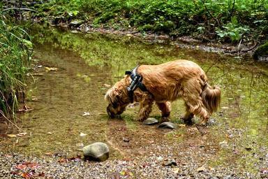 Keywords: nutrition of course dog animal water drink bach idyllic romantic refreshment waters mood nature river rest bank forest atmosphere