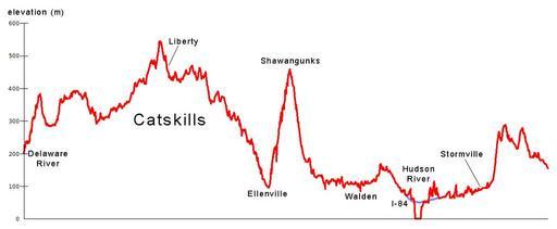 | Keywords: NY 52 profile.png This is an elevation profile of New York State Route 52 The GIS data used was U S Census TIGER/Line data for the road and USGS Digital Elevation Model data The image is not in SVG because ArcMap cannot export an elevation profile as SVG There is no horizontal scale because the TIGER/Line data does not show every small curve and so the length in the data is shorter than the actual length The actual length of NY 52 is 108 72 mi 174 97 km The blue line shows the overlap with Interstate 84 including the Newburgh-Beacon Bridge which is different from the terrain red due to cuts fills and bridges The red line shows the terrain which normally matches the road but there are exceptions For instance the dip east of Ellenville is bridged by NY 52 New York State Route 52 Maps of New York 2007-06-24 own assumed NE2 |