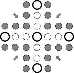 | Keywords: Nyout schematic collapsed.png en Schematic showing how a classic cross and circle board game like the Korean Nyout Yut can be deformed into a topologically equivalent cruciform board like the Indian Pachisi own Phil wink 2009-12-30 Nyout schematic collapsed svg Yut |