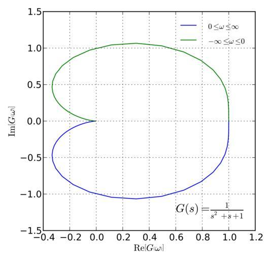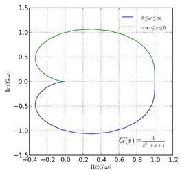 | Keywords: Nyquist example.svg The Nyquist Plot for a sample function <math>G s \frac 1 s 2+s+1 </math> that can be converted to frequency by replacing <math>s</math> with <math>j\omega</math> imaginary frequency and <math>-\infty\leq\omega\leq\infty</math> Created using Python and matplotlib own 2006-03-27 Utkarsh Upadhyay --Krishnavedala <span class signature-talk >talk</span> 20 21 3 June 2011 UTC python version Public Domain validSVG Source Code <syntaxhighlight lang python > from numpy import from matplotlib pyplot import def nyquist w compute the complex Nyquist response s complex 0 w return 1/ s 2+s+1 fig figure figsize 5 5 ax fig add_subplot 111 ax grid True t N linspace 0 5 pi 200 5 pi is approx to infinity for i in t compute the complex response for +ve omega N append N nyquist i ax plot real N imag N label r 0\leq\omega\leq\infty t N linspace -5 pi 0 200 for i in t compute the complex response for -ve omega N append N nyquist i ax plot real N imag N label r -\infty\leq\omega\leq 0 ax legend frameon False setp ax get_legend get_texts fontsize 'small' ax set_xlabel r \mathrm Re \leftG\left \omega\right \right ax set_ylabel r \mathrm Im \leftG\left \omega\right \right ax text 0 6 -1 25 r G s \frac 1 s 2+s+1 \ fontsize 15 fig show fig savefig Nyquist example svg bbox_inches tight \ pad_inches 15 </syntaxhighlight> cob Created with Matplotlib Images with Python source code Nyquist plots Cybernetics |