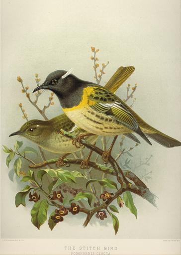 | Keywords: NZ Stitchbirds.jpg The Stitch bird Pogonornis cincta en A male and female Stitchbird/Hihi Notiomystis cincta Buller's A History of the Birds of New Zealand 2nd edition Published 1888 Published 1888 By J G Keulemans PD-old-auto-1923 1912 thumb left checked WikiProject Birds A History of the Birds of New Zealand by Buller Plate XI Notiomystis cincta |