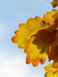 Keywords: oak leaves oak quercus sessile oak quercus petraea winter oak golden autumn golden october autumn october forest leaves golden bright sun back light colorful color tree road fall foliage