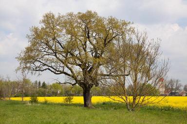 Keywords: oak tree old oak landscape quercus german oak spring deciduous tree meadow field of rapeseeds nature recovery rest