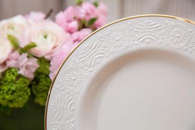 Each dinner plate in the Obama china service is 12 inches in diameter. The lip of the dinner plate is plain gold gilt. The broad rim of the plate has an undecorated pinwheels and fronds in bas-relief. The bas-relief design was taken from the enamel decoration on the Empire-style china service purchased by James Madison in 1806. The bas-relief element is unique to White House china, which has never featured anything like it before.