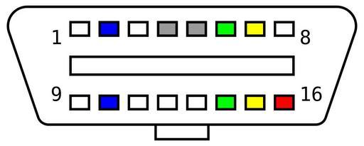 Keywords: OBD connector shape.svg en Female OBD connector shape and pinout The pins inside the connector are female while the connector itself the plastic body is male es Aspecto y posición de los contactos en un conector OBD 2014-01-30 11 12 04 own Xoneca OBD-connector-pinout png OBD-II type A female connector shape svg OBD-II type B female connector shape svg wikitable colspan 2 Legend - red width 10 Battery +12Vcc common to all protocols - gray Ground common to all protocols - blue SAE J1850 PWM/VPW - lime ISO 15765-4 CAN - yellow ISO 9141-2/14230-4 - white Manufacturer-specific function cc-zero Inkscape-hand smoothed Uploaded with UploadWizard Pinouts of vehicle connectors Obd2