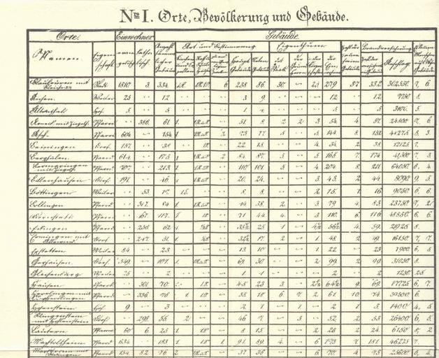 | Keywords: Oberamt Blaubeuren Tabelle 1a.jpg de Dies ist ein Scan des Buches en This is a scan of the book Beschreibung des Oberamts Blaubeuren Cotta Stuttgart und Tübingen 1830 Blaubeuren Stadt im Alb-Donau-Kreis /Baden-Württemberg Source de Scan einer Faksimileausgabe Bissinger Magstadt 1976 ISBN 3-7644-0007-2 en Scan from facsimile edition Bissinger Magstadt 1976 ISBN 3-7644-0007-2 Date 1830 Author Prof Johann Daniel Georg von Memminger 1773-1840 Oberamt Blaubeuren PD-old | ||||