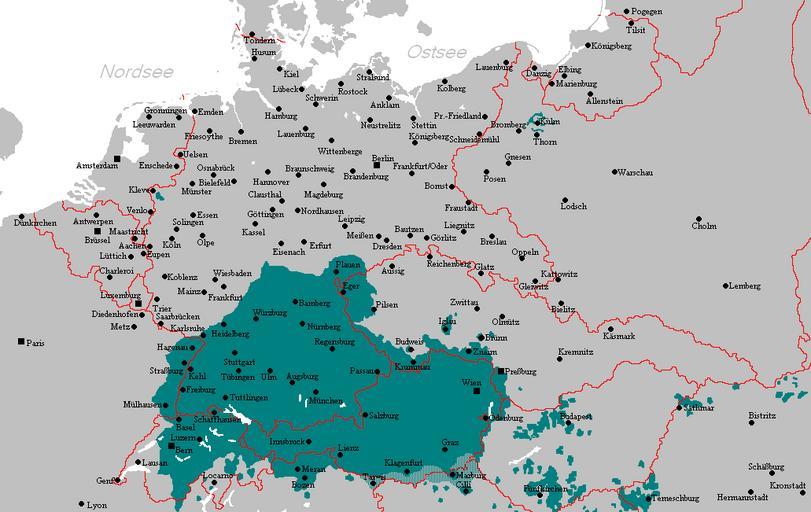 | Keywords: Oberdeutsches Sprachgebiet-1937.PNG design by Postmann Michael date 25 Febr 2006 Public domain Die Darstellungskarte zeigt das historische oberdeutsche Sprachgebiet mit den Staatsgrenzen vom 31 Dezember 1937 Nach dem Ende des zweiten Weltkrieges 1945 wurde das oberdeutsche Sprachgebiet infolge von Flucht und Vertreibung der deutschsprachigen Bevölkerung Teile von ihnen siedelten seit rund 700 Jahren in diesen Gebieten geschmälert <span style background-color 5AA2A5 > </span> Slowenisch-Deutsche Mischbesiedlung im Raum Kärnten/Steiermark Österreich/Slowenien The representation map shows the historical upper-German language area with the state borders from 31 December 1937 After the end of the Second World War 1945 the upper-German language area was diminished due to escape and driving of the German-speaking population out parts of them settled for approximately 700 years in these areas <span style background-color 5AA2A5 > </span> Slovenian-German mixed regions of Carinthia/Styria Austria/Slovenia Quelle/Source dtv-Atlas zur deutschen Sprache S 230/231 dtv Atlas to the German language P 230/231 Der Fischer Informations-Atlas Bundesrepublik Deutschland S 63 Fischer information Atlas Federal Republic of Germany P 63 see also <gallery> File Historisches deutsches Sprachgebiet PNG Deutsch ~1910 File Verbreitungsgebiet der deutschen Sprache PNG Deutsch ~1950 </gallery> Postmann Michael Linguistic maps of the German language Ethnographic maps of Austria-Hungary |