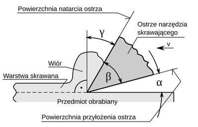 Keywords: Obrobka skrawaniem.svg en Machining diagram pl Schemat skrawania <br>α - kąt przyłożenia<br>β - kąt zaostrzenia<br>γ - kąt natarcia own Swisstack 2010-08-31 100px Machining