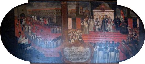 | Keywords: Obruchenie mnishek.jpg Wedding of False Dmitri and Marina Mniszech in Moscow on May 8 1606 Ślub Dymitra Samozwanca i Maryny Mniszchówny w Moskwie 8 maja 1606 Венчание Лжедмит ия и а ины нишек в оскве 8 мая 1606 года Creator Szymon Boguszowicz ca 1613 oil canvas State Historical Museum Moscow Plafond ceiling painting from a coffered Venetian ceiling executed to adorn the so-called Family Room Sala Familii in the Laszki Murowane Castle The cycle originally consisted of 10 plafond paintings and 2 freize paintings on opposite walls depicting the story of Marina Mniszech Изоб ажены пат иа х Игнатий и под флагом сандоми ский Ю нишек ногочисленные неточности в пе едаче деталей гово ят о том что художник никогда не был в России Object history < 1613 commission Jerzy Mniszech and Jadwiga Tarło century 18 transfer Wiśniowiec Palace own неизвестный художник PD-Art PD-old-100 Paintings from Laszki Murowane Castle Tsar's weddings Uploaded by Shakko/Photos |