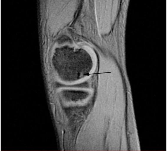 | Keywords: OCD WalterReed MRI-Sagital-T2.jpeg en Sagittal and coronal T1 and T2 images demonstrate linear low T1 high T2 signal at the articular surfaces of the lateral aspects of the medial femoral condyles bilaterally corresponding to the radiographs confirming the presence of bilateral osteochondritis dissecans with diffuse increase in T2 signal at the medial femoral condyles indicating marrow edema From the case of a 9-year-old boy with bilateral knee pain Uniformed Services University Obtained from MedPix Database http //rad usuhs mil/medpix/medpix_image html imageid 14470 Pil Kang 2003-02-04 PD-USGov Magnetic resonance imaging of the knee MRI of osteochondritis dissecans |