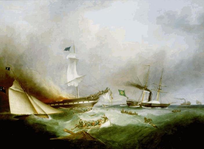 | Keywords: Ocean Monarch.jpg oil canvas in 41 52 Peabody Essex Museum Salem Massachusetts object history credit line <small>Launched only the previous year and described as one of the finest and largest ships ever built in the United States the OCEAN MONARCH was a notable addition to Enoch Train's White Diamond Line of Boston-to-Liverpool sailing packets Her total loss with almost half of those on board aroused enormous public sympathy on both sides of the Atlantic <br /><br /> Walters painted at least three pictures showing successive stages of the conflagration and rescue attempts this being the intermediate one when only the foremast was still standing First on the scene was the cutter yacht QUEEN OF THE OCEAN commanded by Thomas Littledale Commodore of the Royal Mersey Yacht Club seen on the left in the painting having launched her boat to pick up survivors On the right is the Liverpool-built Brazilian naval steam frigate AFFONZO Having started in the after cabin the inferno has now reached the bow with only a small group crowding forward of the foremast and out onto the bowsprit The jib boom has given way and some desperate survivors are using it as a means of escape Women and children too terrified to make any such attempt were rescued by Frederick Jerome a British crew member of the nearby American sailing packet NEW WORLD Climbing aboard by means of the trailing gear and rigging he succeeded in lowering them to within reach of the waiting rescuers <br /><br /> Shortly afterwards the foremast fell as portrayed in another painting by Samuel Walters Within a few hours the OCEAN MONARCH burned right down to the waterline and subsequently sank The hulk remnants still lie on the seabed northeast of the Great Orme the outline of which is visible just astern of the AFFONZO </small> accession number http //www pem org/archives/mpd/t23275 htm Peabody Essex Museum PD-old-100 1850 paintings Burning ships in art Donald McKay Samuel Walters Oil paintings in Peabody Essex Ship disasters in the 1840s Ocean Monarch ship 1848 19th-century sailing ships in paintings |