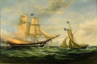 | Keywords: Ocean Monarch 1848 byWalters.png Artwork Creator Samuel Walters <small>The Ocean Monarch was one of nine large packet ships built by the famous shipbuilder Donald McKay in Boston for Enoch Train ™s White Diamond Line of Boston-Liverpool vessels The Monarch measured 179 feet in length and 1 301 tons and was launched in July 1847 On August 24 1848 the vessel cleared Liverpool for Boston with 396 passengers including 322 Irish emigrants Just a few hours later a few miles off the coast of Wales a fire around the mainmast was reported probably started by a passenger smoking The Monarch stopped and dropped two anchors to gain control of the fire but it spread too quickly starting a panic among the passengers <br /> Commander Thomas Littledale of the yacht Queen of the Ocean was first on the scene Returning to Liverpool with a group of friends after the Beaumaris regatta he managed to rescue 32 people from the burning ship including Captain Murdoch Other ships picked up another 188 persons; the ship and 178 passengers were lost when the ship sank at its anchors in 85 feet of water <br /> The painting shows the middle stage of the fire with one mast down and red flames at the stern and amidships Panicked people are crowded forward of the smoke and flames overflowing out on the bowsprit and to the very tip of the jib-boom Some survivors can be seen in the sea clinging to the wreckage of the mizzenmast To the right is the yacht Queen of the Ocean and a sailboat <br /> This painting is believed to have been commissioned by Capt Littledale to feature his heroic rescue The Museum owns another Walters painting of the disaster that features another vessel in the foreground and two other Walters paintings in different collections highlight still other vessels ™ rescue of the passengers and crew <br /> The dramatic loss of the Ocean Monarch and so many of its passengers so close to shore so soon after departure as well as its thrilling rescue touched off an international wave of sympathy and a media storm on both sides of the Atlantic </small> 1848 oil canvas cm 79 7 121 3 Smithsonian American Art Museum object history credit line accession number 2005 0279 066 http //americanhistory si edu/onthewater/collection/2005 0279 066 html CIGNA Museum and Art Collection PD-old-100 Samuel Walters Ocean Monarch ship 1848 Paintings in the Smithsonian American Art Museum Walters 1848 paintings Burning ships in art Ship disasters in the 1840s 19th-century sailing ships in paintings |