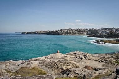 Keywords: ocean sea shore coast rocks water nature bay cove town city person sitting looking view panorama summer beach travel vacation sun holiday seascape turquoise tranquil seaside