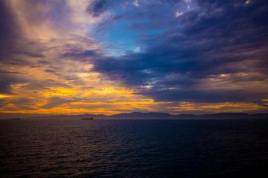 Keywords: ocean sunset boats sea water sun sky nature travel beach coast orange waves light horizon evening blue clouds calm twilight yellow summer coastline dramatic