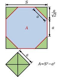 Keywords: Octagon in square.svg en An octagon of side length a in a circle of side length S where S is the span of the octagon The area of the octagon A is then given by <math>A S 2-a 2</math> own Inductiveload 2009-03-22 Regular octagons