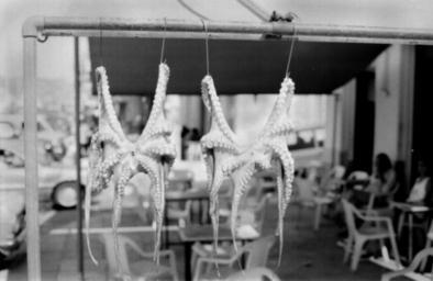 Keywords: Octopi drying.jpg en black and white 35mm photo of two Octopi hanging in the sun in Greece 2013-07-23 08 01 54 own paul ensign cc-zero Octopus as food Cuisine of Greece Uploaded with UploadWizard July 2013 in Greece 23