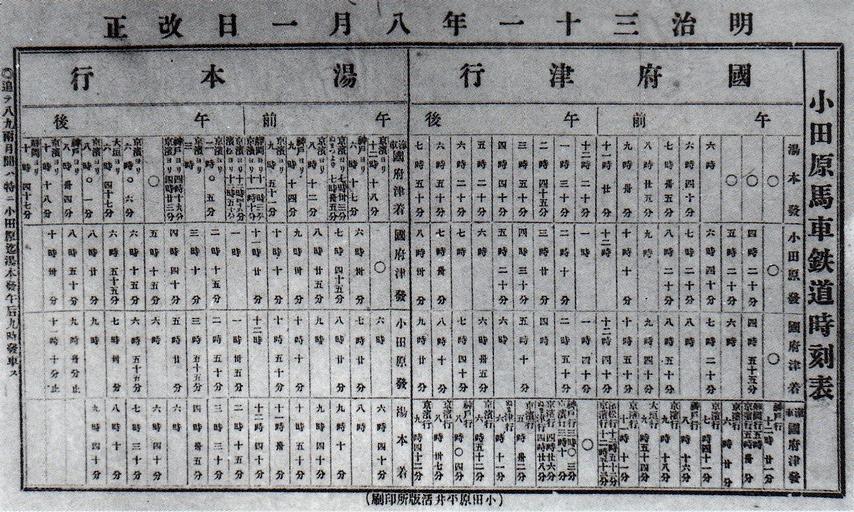 | Keywords: Odawara Basha Tetsudo TimeTable 18980801.jpg en Timetable of Odawara wagon railway ja 1898年8 1日改正の小田原馬車鉄道時刻表 Japanese Book すばらしい箱根 グラフ100 p 32 箱根登山鉄道株式会社総務部総務課 1988年8 Author from 1898 PD-Japan-organization PD-Japan-organization Hakone Tozan Railway Public transport timetables of Japan Chinese numerals Japanese writing from right to left |