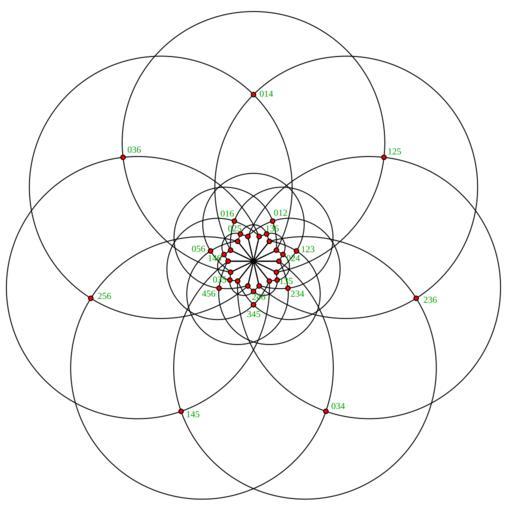 | Keywords: Odd graph O4.svg odd graph O<sub>4</sub> The vertices are partially labeled with the digits from 0 to 6 describing the members of the corresponding sets; the remaining labels may be determined as the digits not present in any neighboring vertex own David Eppstein 2010-08-24 Files by User David Eppstein from en wikipedia Odd graph |