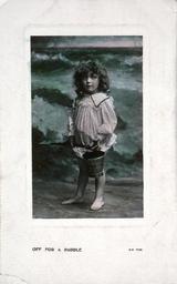| Keywords: paddle bathing swimming swimmers swimsuit swimwear child children bucket spade beach beaches sydney beagles postcards beaglespostcards wave water vintage children's clothing vintagechildrensclothing postcards people Photographic hand coloured postcard, titled, `Off for a paddle.' Reverse inscribed: `Beagles postcards. S.W. Series, Sydney'. Depicts a child dressed for the beach, with a bucket and spade, in a studio setting. Dated 16/08/09. The ANMM undertakes research and accepts public comments that enhance the information we hold about images in our collection. This record has been updated accordingly. Object number: 00002856 Photographic hand coloured postcard, titled, `Off for a paddle.' Reverse inscribed: `Beagles postcards. S.W. Series, Sydney'. Depicts a child dressed for the beach, with a bucket and spade, in a studio setting. Dated 16/08/09. The ANMM undertakes research and accepts public comments that enhance the information we hold about images in our collection. This record has been updated accordingly. Object number: 00002856 |