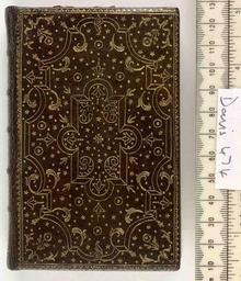 | Keywords: Office de la semaine sainte - Upper cover (Davis474).jpg Style All over design Pointille comprising dots Floral; Caption Upper cover; Colour Brown; Edge Gilt exhibition history Decorative Technique Tooled in gold; Cover Material Goatskin includes morocco turkey etc 3 ribbon markers 2 red 1 blue With a green goatskin slip case signed R Wallis Binder object history Text 1707; Paris; Unspecified object type Cc-zero place of creation Binding France place of discovery See M M Foot The Henry Davis Gift vol I London 1978 p 202 n21 Also Henry Davis Gift vol III British Library image http //www bl uk/catalogues/bookbindings/LargeImage aspx RecordId 020-000004148 ImageId ImageId 41679 Copyright BL Office de la semaine sainte Uploaded with GWToolset Office de la semaine sainte - Upper cover Davis474 http //www webarchive org uk/bldatasets/bindings/6195_4 jpg Bookbinding 18th-century bookbinding British Library Bookbindings |
