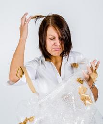 Keywords: office packaging tape frustration stuck hair woman package business mail post parcel corporate shipping people person female worker professional white caucasian businesswomen