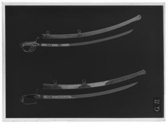 | Keywords: Officerssabel, Frankrike ca 1815-1818, tillåten modell, Sverige - Livrustkammaren - 777-negative.tif Fäste av förgylld reliefornerad mässing kavelns sidostycken av pärlemor <br/><br/>Kappa framtill i form av ett lejonhuvud med manen inramad av en slät list och baktill övergående i ett insvängt och nedåtböjt mellanled på vars översida ett palmettliknande ornament Nederdelen formad som en nedåtriktad fjällmönstrad holk Handbygel platt överdelen intappad i lejonets gap nederdelen insvängd och med ett spiralornament rätvinkligt övergående i den raka främre parerstången; handbygelns utsida ornerad med en längsgående bladranka något ovanför mitten en infälld trofégrupp Bakre parerstång rak med nedåtböjd ytterände formad som en palmett Styrskenor med tvärt avskuren överdel och vidgad rundad nederdel den förra ornerad med ett palmettliknande ornament den senare med en mansmaskaron omgiven av bladornament <br/>Kavel med rektangulärt tvärsnitt avsmalnande uppåt de smala fram- och baksidorna belagda med en 15mm bred bård av förgylld mässing ornerad med en längsgående tuktad lagerranka; ut- och insidorna belagda med släta pärlemorskivor med en bredd nedtill av 35 mm <br/><br/>Klinga böjd eneggad utom vid det tvåeggade spetspartiet; ryggen plan Fram till spetsen en bred grund hålkäl Starka delen med etsad och förgylld ornering mot blånerad botten som upptill är snett avskuren mot eggsidan; ryggpartiet förgyllt den blånerade bottnen med en smal förgylld kantbård Baspartiet med ett förgyllt rektangulärt fält vari tecknat med tunna linjer trekronorsvapnet i oval sköld mot tvärstreckad botten över skölden en girland Ovanför baspartiet under svensk hertigkrona ett graverat monogram i skrivstil C J det hela förgyllt Upptill en femuddig förgylld stjärna omgiven av strålar original caption - 1815 1818 brass b1 - blankvapen - fäste material mässing - mother-of-pearl b6 - blankvapen - kavel och kavelklädsel material pärlemor - steel b2 - blankvapen - klinga material stål size mm 1024 size mm 132 size mm 880 klinga size mm 32 klinga g 800 LRK C J hertigkrona anv b5 - blankvapen - klingdekor; Karl XIV Johan av Sverige-Norge C J hertigkrona anv b5 - blankvapen - klingdekor; Karl XIV Johan av Sverige-Norge place of origin original filename LN_B04890_007770 49849 inventory number LRK 13321 777 CC0 Officerssabel Frankrike ca 1815-1818 tillåten modell Sverige - Livrustkammaren - 777 tif |