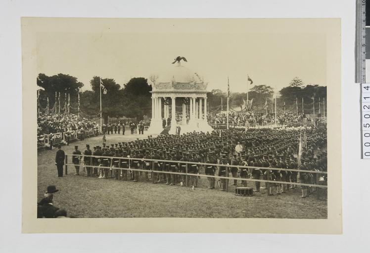 | Keywords: unitedstatesnavy usnavy warships sydney greatwhitefleet admiralsperry domain photo border outdoor This photograph depicts the official reception of Admiral Perry, Commander of the United States' Great White Fleet to the Domain, Sydney. It was printed to commemorate this event in 1908 and was one of many souvenirs produced for the occasion. The images in this set document the arrival in Sydney of 16 American warships as they circumnavigated the world during a goodwill voyage from December 1907 February 1908. Object number 00050214 Interested in other items relating to the Great White Fleet? Check out our blog: bit.ly/IEoF7B This photograph depicts the official reception of Admiral Perry, Commander of the United States' Great White Fleet to the Domain, Sydney. It was printed to commemorate this event in 1908 and was one of many souvenirs produced for the occasion. The images in this set document the arrival in Sydney of 16 American warships as they circumnavigated the world during a goodwill voyage from December 1907 February 1908. Object number 00050214 Interested in other items relating to the Great White Fleet? Check out our blog: bit.ly/IEoF7B |