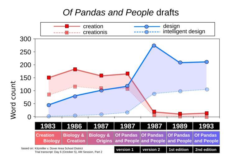 | Keywords: OfPandasAndPeople-c-vs-id-en.svg The change in the numbers of expressions creation design creationis and intelligent design in the versions of the book Of Pandas and People from 1983 to 1993 Kitzmiller v Dover Area School District Trial transcript Day 6 October 5 AM Session Part 2 http //www talkorigins org/faqs/dover/day6am2 html day6am889 talkOrigins non-copyright exhibits from the trial http //www2 ncseweb org/kvd/ 16 22 13 May 2008 UTC G ambrus based on the sources listed above Creationism Intelligent design Kitzmiller v Dover Area School District |