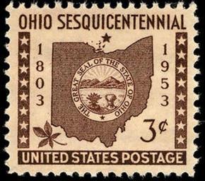 | Keywords: Ohio statehood 1953 U.S. stamp.1.jpg en Ohio commemorated its 150th anniversary on a 3-cent stamp issued March 2 1953 The central design features the state seal imposed on a map outline of the state It is flanked by sixteen stars representing states admitted previously a seventeenth star representing Ohio in the top center and a buckeye leaf in the lower left 2014-04-10 06 52 37 Arago people postage the post online National Postal Museum Bureau of Printing and Engraving PD-USGov Uploaded with UploadWizard U S territories on stamps Stamps of the United States 1951-1960 |