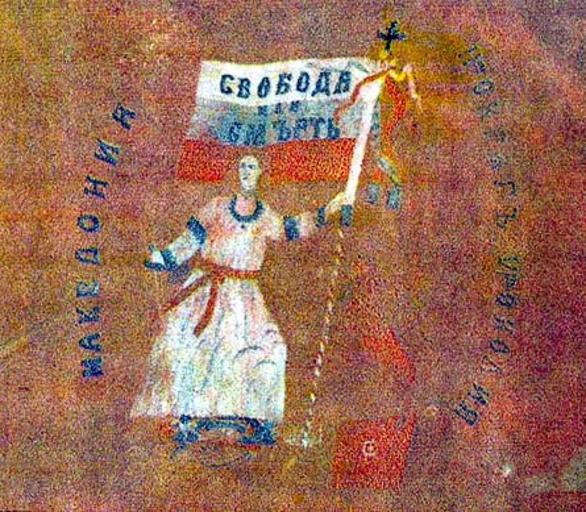 | Keywords: Ohrid Banner1.jpg Flag of the Bulgarian rebels in the Ilinden-Preobrazhenie Uprising Since 1946 the flag has been kept in the National Museum of Military History in Bulgaria Imbox none Flag of the insurgents from Ohrid /79/ Made from double red silk fabric with dimensions 94x78 cm Face side shows upright crowned lion stepping upon a crescent Around him it is written In Bulgarian God is with us Forward brothers The victory is ours Ohrid 1903 Left and Right of the lion shown are lyrics from Hristo Botev On the back side of the fabric the is a figure of dark haired young woman holding a sword in her right hand and the tri-color with a slogan Freedom or Death Next to her lion standing on the enemy's flag The woman is stepping on broken slave chains and battle axes On the side there is the sign Macedonia 2nd region area 6 The flag was made by Ohrid teachers Polyxena Mosinova Vasilka Razmova Klia Samadzhieva and Kostadina Bojadvieva /80/ It is blessed by father Vasil Popangelov organizer of the uprising in Dolna Deburca in front of 600 insurgents and peasants on 23 July 1903 in Visloec Ohrid region There are insurgents present from Kuratitza Brezhani Plake and Oleinitza The ritual is concluded when insurgents go under the flag hats down and kiss it In the end of the ceremony Hristo Uzunov and Anton Keckarov hold speeches The flag is given to Uzunov and he leads his squad in the Ohrid Debar and Struga regions Since 1946 the flag is kept in the Musem of Military History in Sofia Transferred from http //en wikipedia org en wikipedia; transferred to Commons by User Commonsnoop using http //tools wikimedia de/~magnus/commonshelper php CommonsHelper 2005-01-25 Original uploader was VMORO at http //en wikipedia org en wikipedia PD-US; PD-ART; PD-ART-US Pd-us Pd-art original upload log page en wikipedia Ohrid_Banner1 jpg 2005-01-25 14 42 VMORO 445×389× 92265 bytes <nowiki>Ohrid Banner1</nowiki> Ilinden-Preobrazhenie Uprising |
