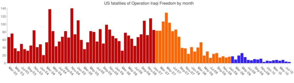 | Keywords: OIF fatalities by month.png Operation Iraqi Freedom by month from beginning to end Based on http //chart apis google com/chart chxr 0 0 140 chxt y chbh a chs 1000x225 cht bvg chco FF6600 chds 0 137 chd t 65 74 37 30 48 35 31 44 82 40 47 20 52 135 80 42 54 66 80 64 137 72 107 58 35 52 80 78 54 85 49 96 84 68 62 55 31 76 69 61 43 65 72 106 70 112 83 81 81 104 126 101 80 84 66 38 37 23 40 29 39 52 19 29 13 23 25 14 17 14 16 17 9 19 25 15 8 7 10 9 11 3 6 5 7 8 6 8 4 3 chtt US+fatalities+of+Operation+Iraqi+Freedom+by+month this Google Chart API graph with further editing in Photoshop The red months are pre-troop surge the orange months are post-troop surge and the blue months are under Obama Although overall month-on-month figures have decreased the total level of coalition forces has also reduced Graph entirely my own work statistics provided by http //icasualties org/Iraq/ByMonth aspx iCasualties 2010-09-20 Smurfy thumb left Convert to SVG Smurfy Original upload log en wikipedia OIF+fatalities+by+month png wikitable - 2013-01-15 17 04 1011×288× 22536 bytes Acaudel <nowiki>Reverted to version as of 16 52 15 January 2013</nowiki> - 2013-01-15 17 03 1000×225× 14782 bytes Acaudel <nowiki>Reverted to version as of 21 46 9 July 2011</nowiki> - 2013-01-15 16 52 1011×288× 22536 bytes Acaudel <nowiki>Trying again Sorry about the multiple uploads Added dates on the bottom Please double check the dates to ensure accuracy </nowiki> - 2013-01-15 16 51 1011×288× 22536 bytes Acaudel <nowiki>Added dates on the bottom Please double check the dates to ensure accuracy </nowiki> - 2013-01-15 16 48 1011×288× 22536 bytes Acaudel <nowiki>Added dates on the bottom Please double check the dates to ensure accuracy </nowiki> - 2011-07-09 21 46 1000×225× 14782 bytes Smurfy <nowiki>Corrected troop surge date to February removed post-war fatalities as they are not part of Operation Iraqi Freedom</nowiki> - 2011-06-15 02 07 1000×225× 15413 bytes Mark Schierbecker <nowiki>post war fatalities</nowiki> - 2010-09-20 18 41 1000×225× 14801 bytes Smurfy <nowiki> Summary A bar graph showing the complete US fatalities from Operation Iraqi Freedom by month from beginning to end Based on http //chart apis google com/chart chxr 0 0 140 chxt y chbh a chs 1000x225 cht bvg chco </nowiki> Casualties of the Iraq War |