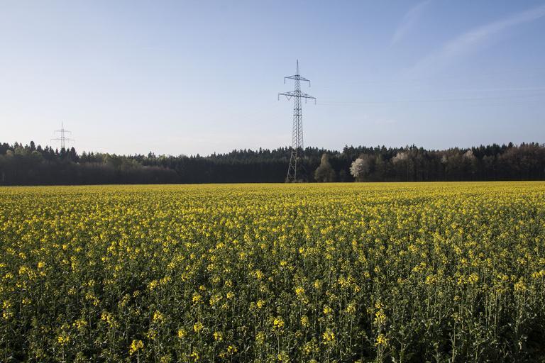 Keywords: oilseed rape agricultural operation yellow field harvest field of rapeseeds arable cultivation flower landscape power poles forest spring