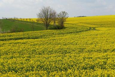 Keywords: oilseed rape blossom bloom agriculture rare plant crop spring nature yellow trees sky blue clouds