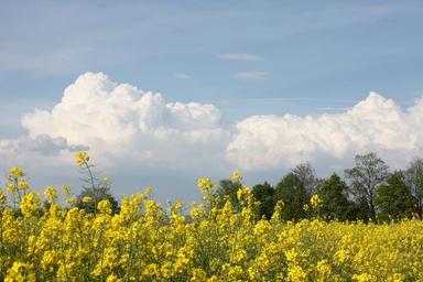 Keywords: oilseed rape field of rapeseeds yellow plant crop blossom bloom trees sky blue clouds