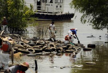 | Keywords: OilSpillTiresCoastGuard.jpg Clean up workers use absorbent products to remove number six fuel oil from the Mississippi River south of New Orleans Friday July 25 after a vessel collision which resulted in nearly 420 000 gallons of fuel oil leaking in to the river U S Coast Guard photo by Petty Officer 2nd Class Thomas M Blue via Coast Guard site At time of upload displayed on front page at http //www uscg mil/; not elsewhere found in photos section 2008-07-25 Petty Officer 2nd Class Thomas M Blue PD-USGov New Orleans oil spill July 2008 men at work in Louisiana |