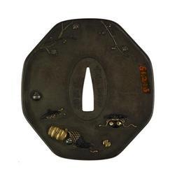 | Keywords: Oishi Akichika - Tsuba with the Treasures of the Seven Gods of Good Fortune - Walters 51215 - Back.jpg This tsuba shows a man gazing up at Mount Fuji surrounded by some of the attributes of the Seven Gods of Good Fortune These are the contents of the treasure bag carried by Hotei one of the gods The man rests against Hotei's bag Next to the bag is a sacred jewel At the bottom of the tsuba is Daitoku's hammer Just above the hammer is a sacred key The disk on the left with notches on two sides is a coin Mount Fuji can be seen in the upper left On the reverse branches of cherry blossoms frame the upper portion of the tsuba Along the bottom from right to left are an inexhaustible bag of money another coin a feather cape a bale of rice a hat the makes the wearer invisible and another treasure jewel 1851 late Edo shibuichi gold silver shakudo cm 9 8 4 0 45 accession number 51 215 13635 Henry Walters Baltimore date and mode of acquisition unknown Walters Art Museum Henry Walters Acquired by Henry Walters Inscrioption kaei kanotoi nanryo/akichika; Translation August 1851/Akichika place of origin Edo present-day Tokyo Japan Walters Art Museum license Tsuba in the Walters Art Museum Oishi Akichika Media contributed by the Walters Art Museum needs category review |