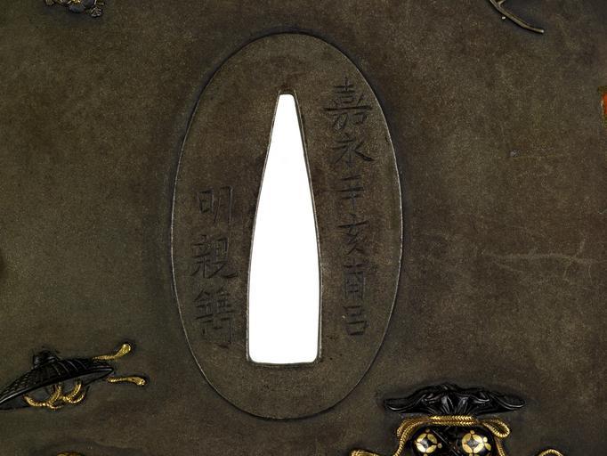| Keywords: Oishi Akichika - Tsuba with the Treasures of the Seven Gods of Good Fortune - Walters 51215 - Mark.jpg This tsuba shows a man gazing up at Mount Fuji surrounded by some of the attributes of the Seven Gods of Good Fortune These are the contents of the treasure bag carried by Hotei one of the gods The man rests against Hotei's bag Next to the bag is a sacred jewel At the bottom of the tsuba is Daitoku's hammer Just above the hammer is a sacred key The disk on the left with notches on two sides is a coin Mount Fuji can be seen in the upper left On the reverse branches of cherry blossoms frame the upper portion of the tsuba Along the bottom from right to left are an inexhaustible bag of money another coin a feather cape a bale of rice a hat the makes the wearer invisible and another treasure jewel 1851 late Edo shibuichi gold silver shakudo cm 9 8 4 0 45 accession number 51 215 13635 Henry Walters Baltimore date and mode of acquisition unknown Walters Art Museum Henry Walters Acquired by Henry Walters Inscrioption kaei kanotoi nanryo/akichika; Translation August 1851/Akichika place of origin Edo present-day Tokyo Japan Walters Art Museum license Tsuba in the Walters Art Museum Oishi Akichika Media contributed by the Walters Art Museum needs category review |