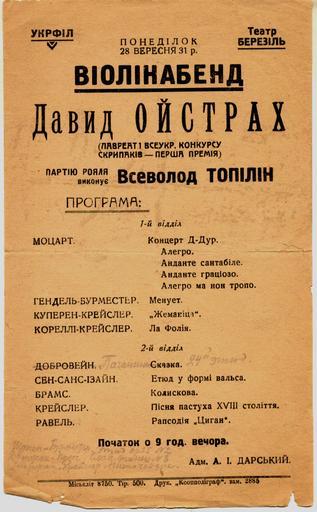 | Keywords: Oistrah David,Topilin.jpg ru Афиша конце та Давида Ойст аха п и участии пианиста Всеволода Топилина кото ый состоялся в Ха ькове в помещении теат а Бе езиль с ка андашными пометками исполненных п оизведений на бис завсегдатая фила монических конце тов музыканта композито а и п офессо а математики Ха ьковского госуда ственного униве ситета им В Ка азина а чевского own Ще бинин Ю ий 28 09 1931 Ха ьков из моих личных а хивов по исто ии музыки в Ха ькове PD-Old Documents of Kharkiv David Oistrach Concert posters of Russia Kharkov posters 1931 in Kharkiv |