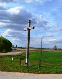 Keywords: Okainėlių kryžius.JPG Kryžkelės kryžius Okainėlių k Kėdainių raj own work 2015-05-01 Šarūnas Šimkus Wooden crosses in Lithuania Kryžiai su koplytelės tipo apvadu ar stogu centre