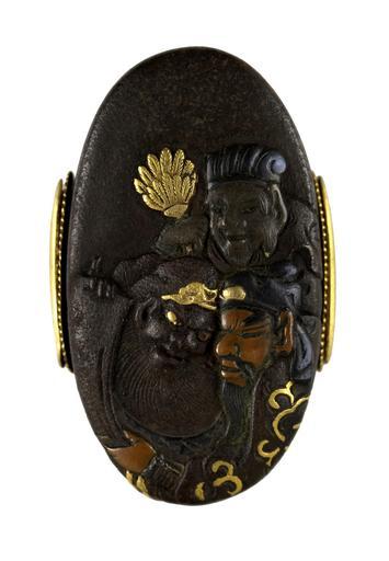 | Keywords: Okamoto Naoshige - Kashira with the Chinese Generals Kanyu, Gentoku and Chohi - Walters 511033 - Top.jpg The three figures on the kashira are the Chinese generals Kanyu Ch Guan Yu Kuan Yu Gentoku Ch Liu Bei Liu Pei and Chohi Ch Zhang Fei Chang Fei They fought together in the 2nd century at the beginning of the Three Kingdoms period Gentoku eventually became emperor of Shu Shu Their story is at the center of the 14th-century Chinese novel Romance of the Three Kingdoms This is part of a set with Walters 51 1032 middle Other date century 18 Edo iron copper gold and silver cm 3 3 accession number 51 1033 20508 Henry Walters Baltimore date and mode of acquisition unknown Walters Art Museum Henry Walters Acquired by Henry Walters none place of origin Kyoto Japan Walters Art Museum license Tosogu Japanese sword fittings in the Walters Art Museum Okamoto Naoshige Media contributed by the Walters Art Museum needs category review Liu Bei Guan Yu Zhang Fei |