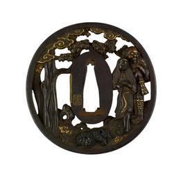 | Keywords: Okamoto Naoshige - Tsuba with Two Figures with a Chinese Lion-Dog - Walters 51349.jpg The openwork design on this tsuba features two figures standing at the right The one in the rear carries a quiver of arrows and a bow He is blowing a long horn The figure in front holds a Chinese style lion-dog shishi on a leash This animal did not exist but is derived from Chinese and Japanese interpretations of stories and paintings of lions in India ca 1765 Edo iron gold copper shakudo cm 7 6 88 0 5 accession number 51 349 11246 Henry Walters Baltimore date and mode of acquisition unknown Walters Art Museum Henry Walters Acquired by Henry Walters Signature Tetsugendô; Seal Kotobuki place of origin Kyoto Japan Walters Art Museum license Tsuba in the Walters Art Museum Okamoto Naoshige Media contributed by the Walters Art Museum needs category review |