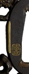 | Keywords: Okamoto Naoshige - Tsuba with Two Figures with a Chinese Lion-Dog - Walters 51349 - Mark A.jpg The openwork design on this tsuba features two figures standing at the right The one in the rear carries a quiver of arrows and a bow He is blowing a long horn The figure in front holds a Chinese style lion-dog shishi on a leash This animal did not exist but is derived from Chinese and Japanese interpretations of stories and paintings of lions in India ca 1765 Edo iron gold copper shakudo cm 7 6 88 0 5 accession number 51 349 11246 Henry Walters Baltimore date and mode of acquisition unknown Walters Art Museum Henry Walters Acquired by Henry Walters Signature Tetsugendô; Seal Kotobuki place of origin Kyoto Japan Walters Art Museum license Tsuba in the Walters Art Museum Okamoto Naoshige Media contributed by the Walters Art Museum needs category review |