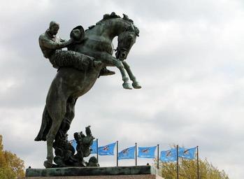 Keywords: oklahoma city oklahoma building capital cowboy horse statue bronze equestrian statue horses statues artwork rider saddle