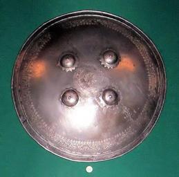 | Keywords: Ökölpajzs.jpg Szürke vaslemezbÅ‘l készült ezüsttel tausÃrozott keleti mintákkal dÃszÃtett ökölpajzs d 400 mm ; h 60 mm ; m 1 25 kg A CsÃki Székely Múzeum tulajdona “ photo taken by uploader User Csanády in 2006 2006-08-23 own assumed Csanády Dhal Round shields |