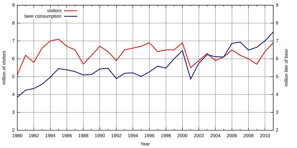 | Keywords: Oktoberfest stats.svg de Entwicklung der Besucherzahlen und des Bierkonsums des Oktoberfests seit 1980 2010-09-18 Created with Gnuplot Own work <br /> Data from http //www muenchen de Gorgo thumb de-version Gnuplot script to generate this plot <source lang gnuplot > /usr/bin/gnuplot gnuplot 4 2 / Ubuntu 8 10 input set timefmt Y set datafile separator ; output set key top left set style data lines set grid set xdata time set xlabel 'Year' set xrange '1980' '2011' set xtics 63072000 set mxtics 2 set format x ' Y' set ylabel 'million of visitors' set ytics nomirror set yrange 2 9 set ytics 1 set y2tics 1 set autoscale y2 set y2label 'million liter of beer' set term svg size 800 400 font Arial 10 set output 'oktoberfest_stats svg' plot '-' using 1 2 title 'visitors' axes x1y1 lt rgb 'red' lw 2 \ '-' using 1 2/10000 title 'beer consumption' axes x1y1 lt rgb 'dark-blue' lw 2 1980;5 1 1981;6 2 1982;5 8 1983;6 6 1984;7 1985;7 1 1986;6 7 1987;6 5 1988;5 7 1989;6 2 1990;6 7 1991;6 4 1992;5 9 1993;6 5 1994;6 6 1995;6 7 1996;6 9 1997;6 4 1998;6 5 1999;6 5 2000;6 9 2001;5 5 2002;5 9 2003;6 3 2004;5 9 2005;6 1 2006;6 5 2007;6 2 2008;6 2009;5 7 2010;6 4 2011;6 9 e 1980;38438 1981;42434 1982;43323 1983;45760 1984;49713 1985;54541 1986;53807 1987;52817 1988;50951 1989;51241 1990;54300 1991;54686 1992;48888 1993;51933 1994;52108 1995;50162 1996;52622 1997;55891 1998;54782 1999;60054 2000;64591 2001;48698 2002;57614 2003;62294 2004;61163 2005;61012 2006;68617 2007;69406 2008;64922 2009;66436 2010;70000 2011;75000 e </source> Oktoberfest Statistics of Munich Images with Gnuplot source code |