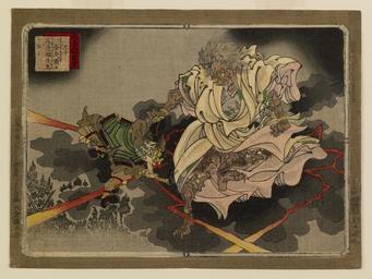 | Keywords: Okura Sombei - Dai Nihon shiryaku zukai - Walters 95639.jpg Watanabe no Tsuna was escorting a beautiful woman home when amidst bolts of lightning she suddenly changed into a hairy demon gripped her escort by the hair and flew off with him Tsuna drew his sword and cut off her arm falling to the ground by Kitano Shrine The demon's fist was still grasping his hair Posing as an old woman the demon later recovered the arm 1885 Meiji pigments mulberry paper cm 17 62 23 97 accession number 95 639 29099 Justine Lewis Keidel date and mode of acquisition unknown Walters Art Museum Gift of Justine Lewis Keidel 1991 Signature Adachi Ginko ga place of origin Tokyo Japan Walters Art Museum license 2D Japanese prints in the Walters Art Museum Historic samurai prints Media contributed by the Walters Art Museum needs category review Adachi Ginko |