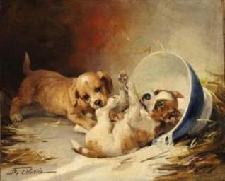 Keywords: Olaria....jpg Chiots jouant oil on canvas cm 38 46 Tragallibres Creator Federico Olaria ~ 1889 PD-old-100 19th-century paintings Olaria Federico Romantic paintings in Spain Federico Olaria 19th-century paintings of dogs